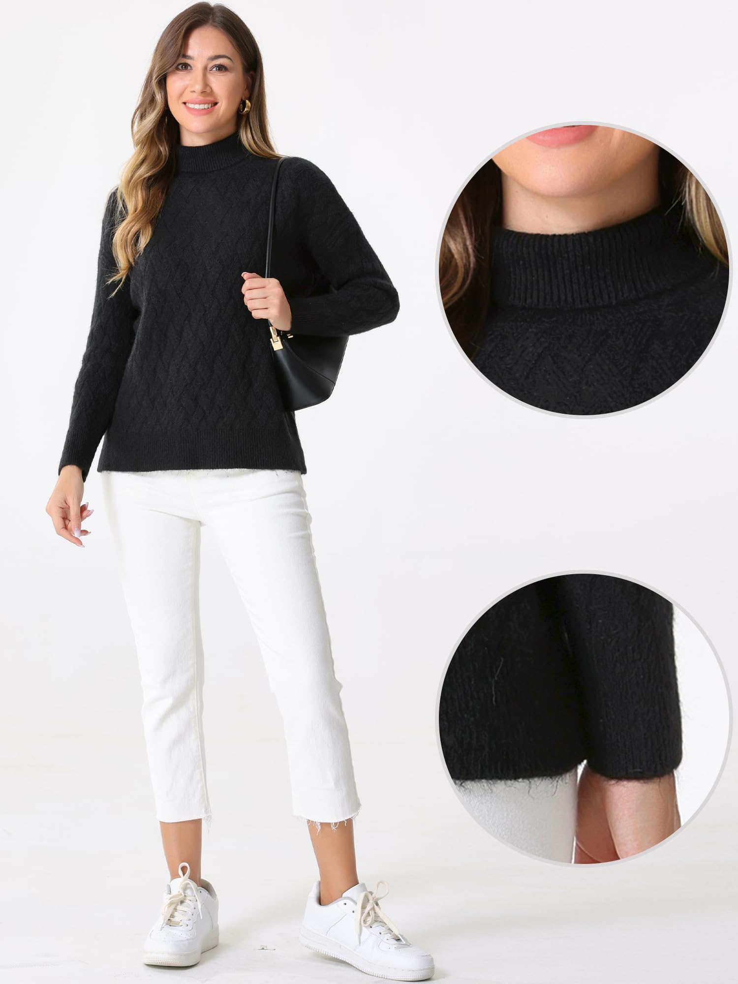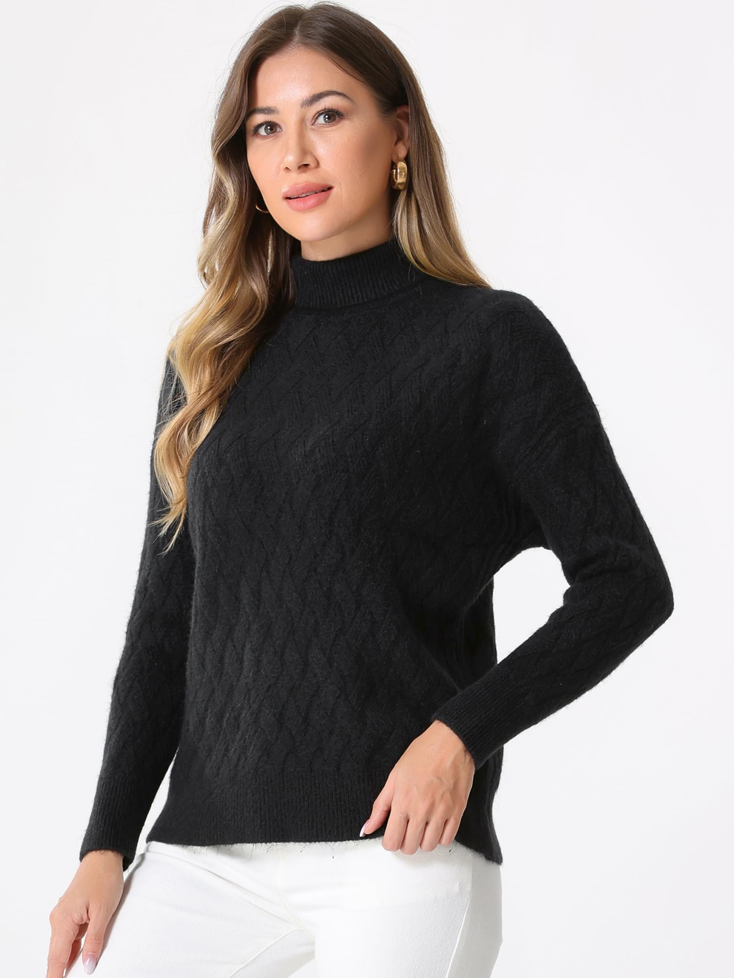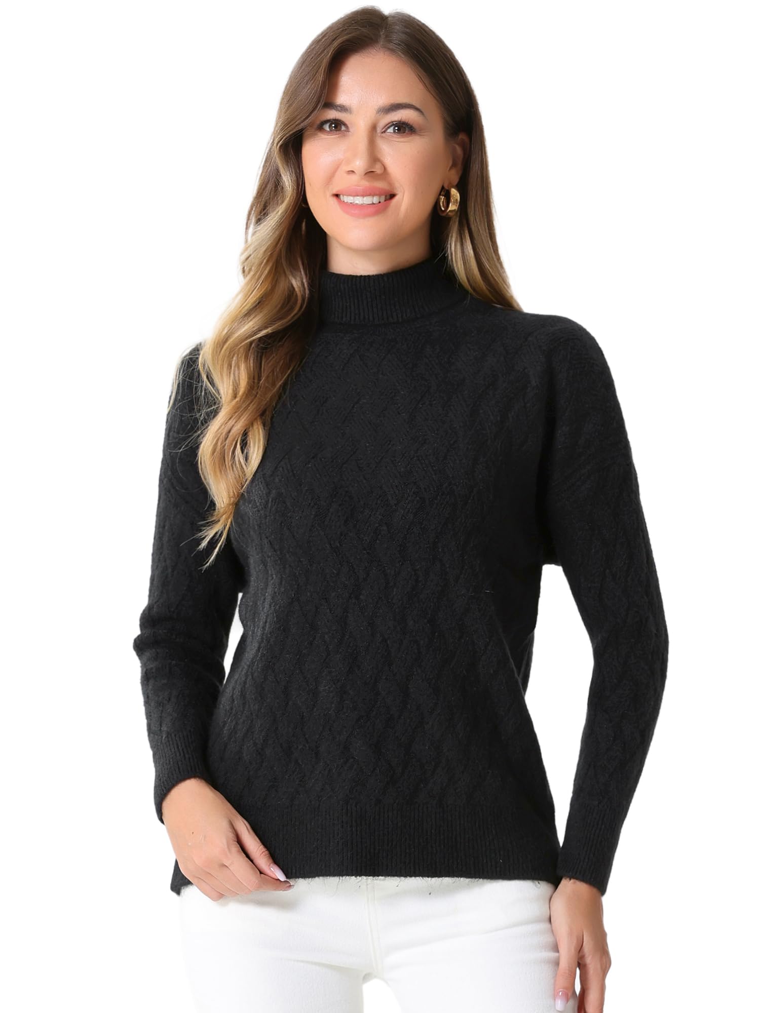Allegra K Pulover cu guler inalt pentru femei, maneca lunga, model cu nervuri, elastic, negru, marimea L