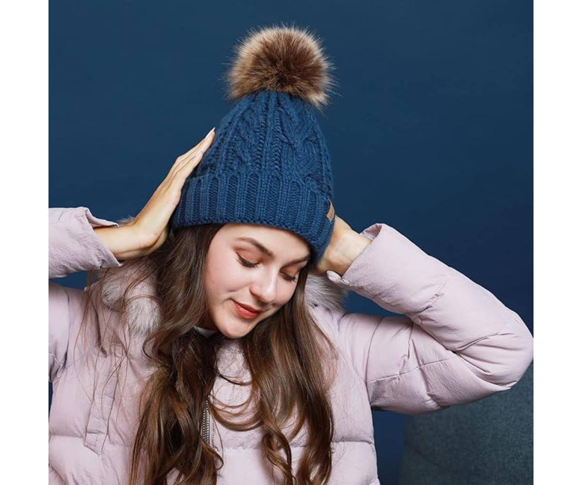 Călduroasă și la modă: Căciula beanie are un design dublu, iar căptușeala moale din fleece te ține mai cald. În partea de sus a căciulii este atașată o minge drăguță de blană, blana fiind bogată și netedă, făcând căciula mai frumoasă și la modă.