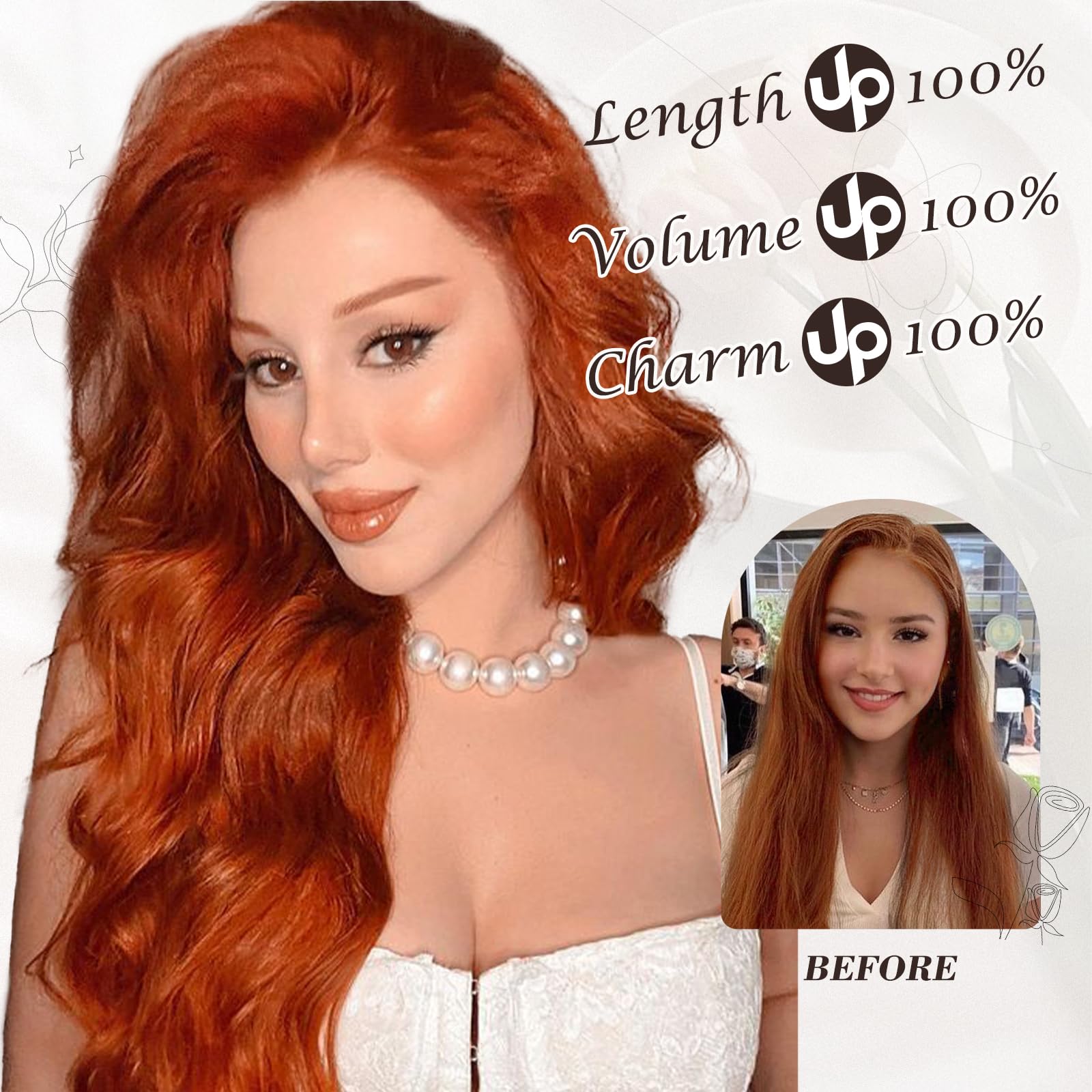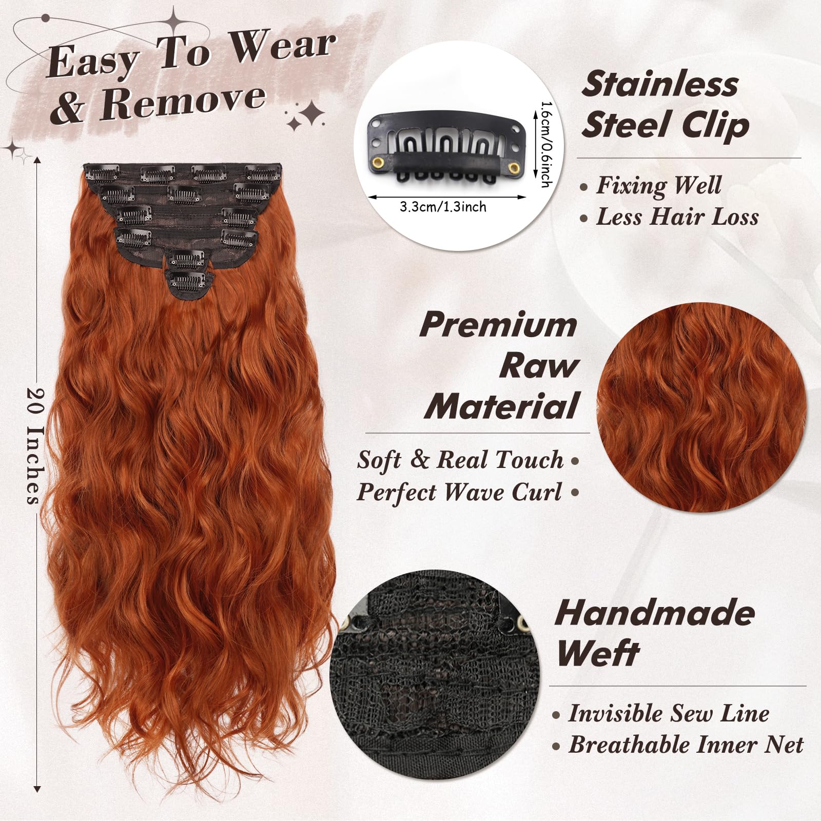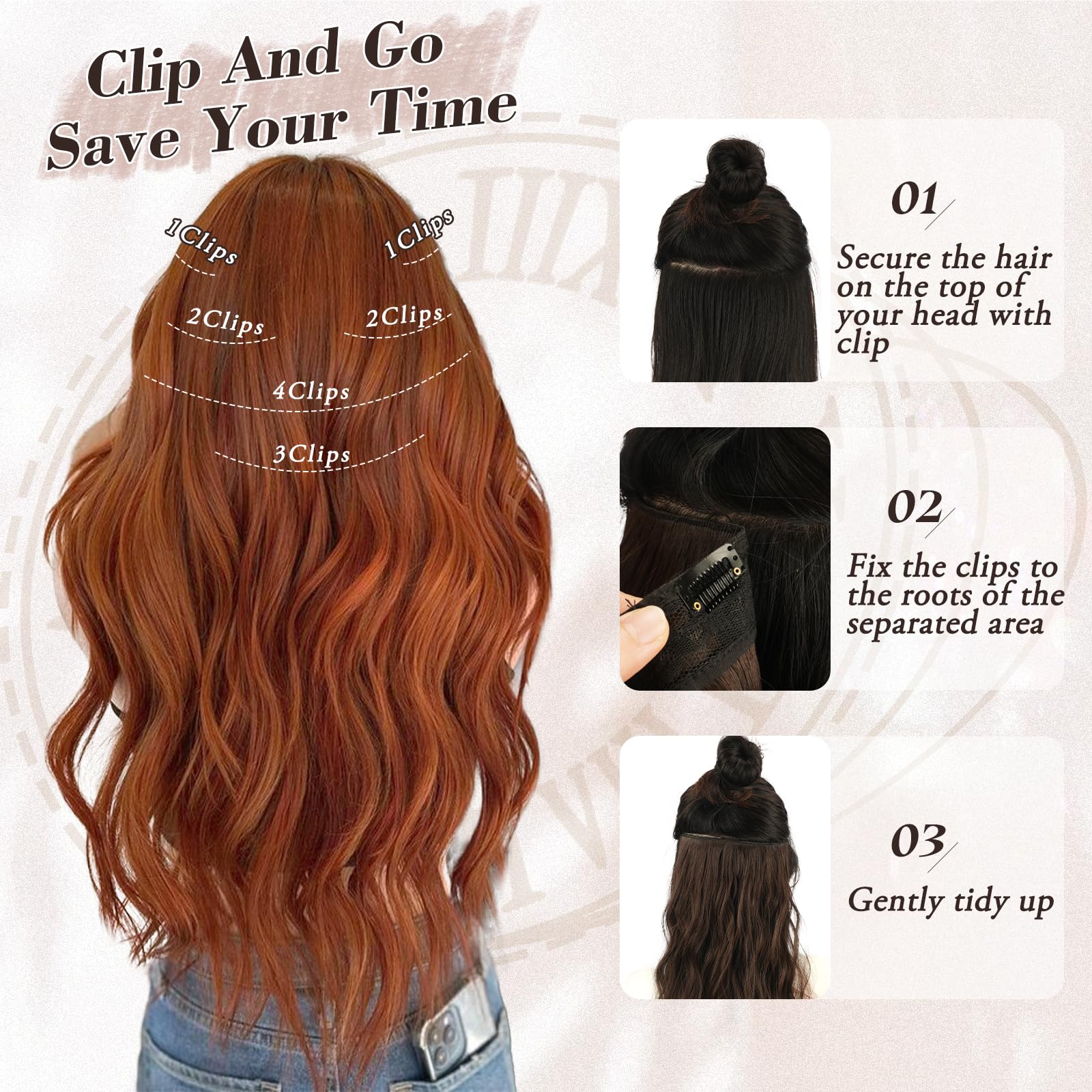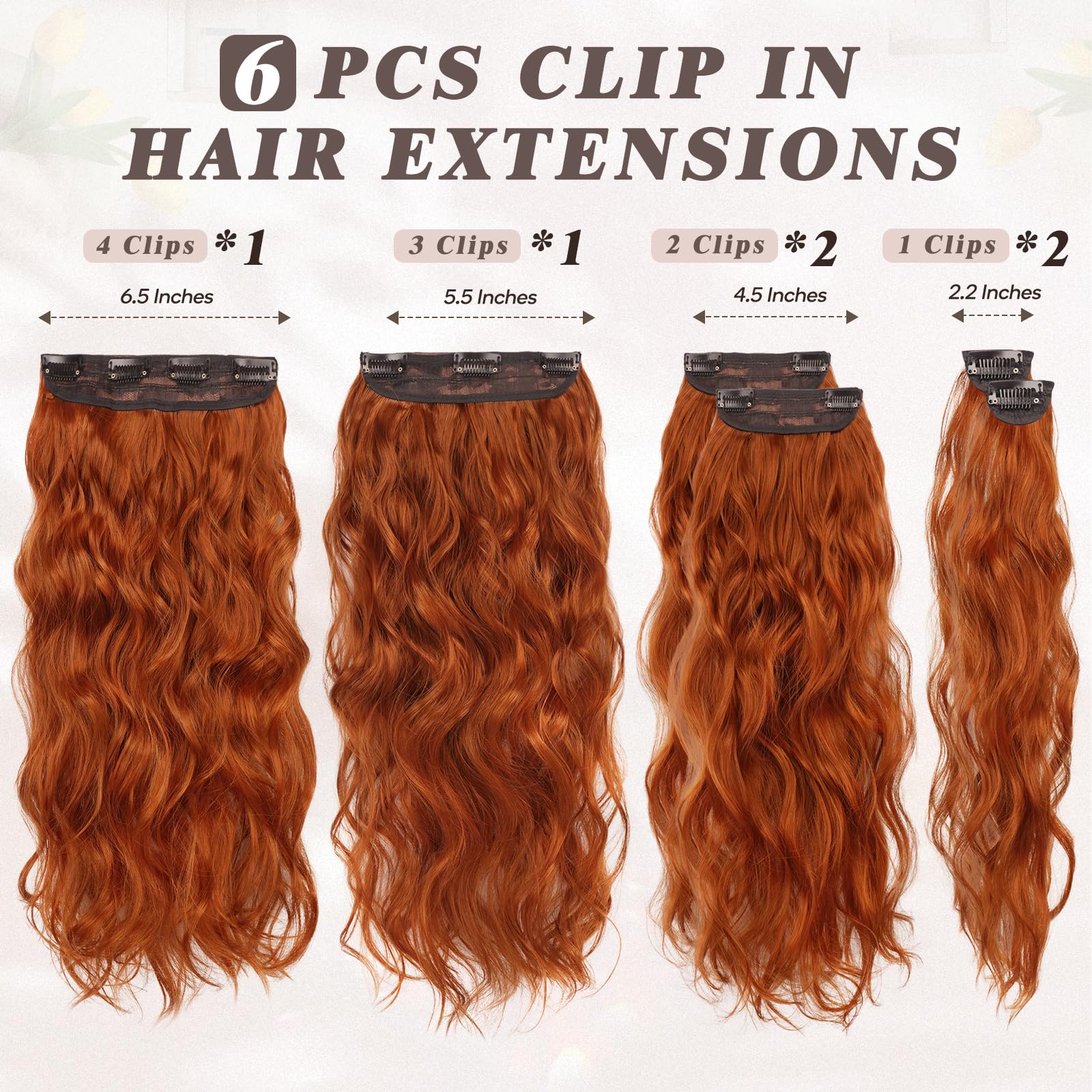 Extensii cu clips, ondulate, rosu-cupru, 50 cm, 6 buc. de latimi diferite