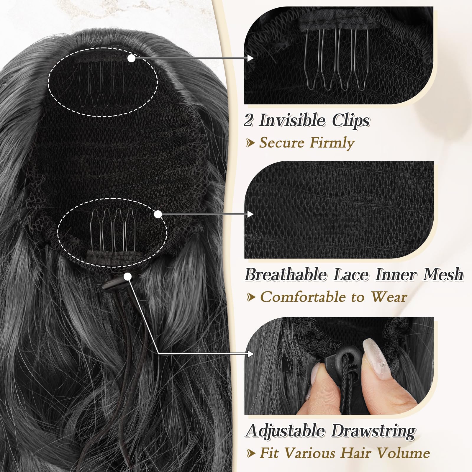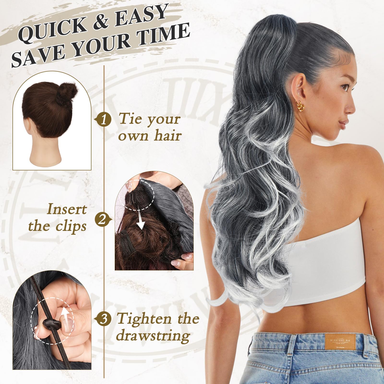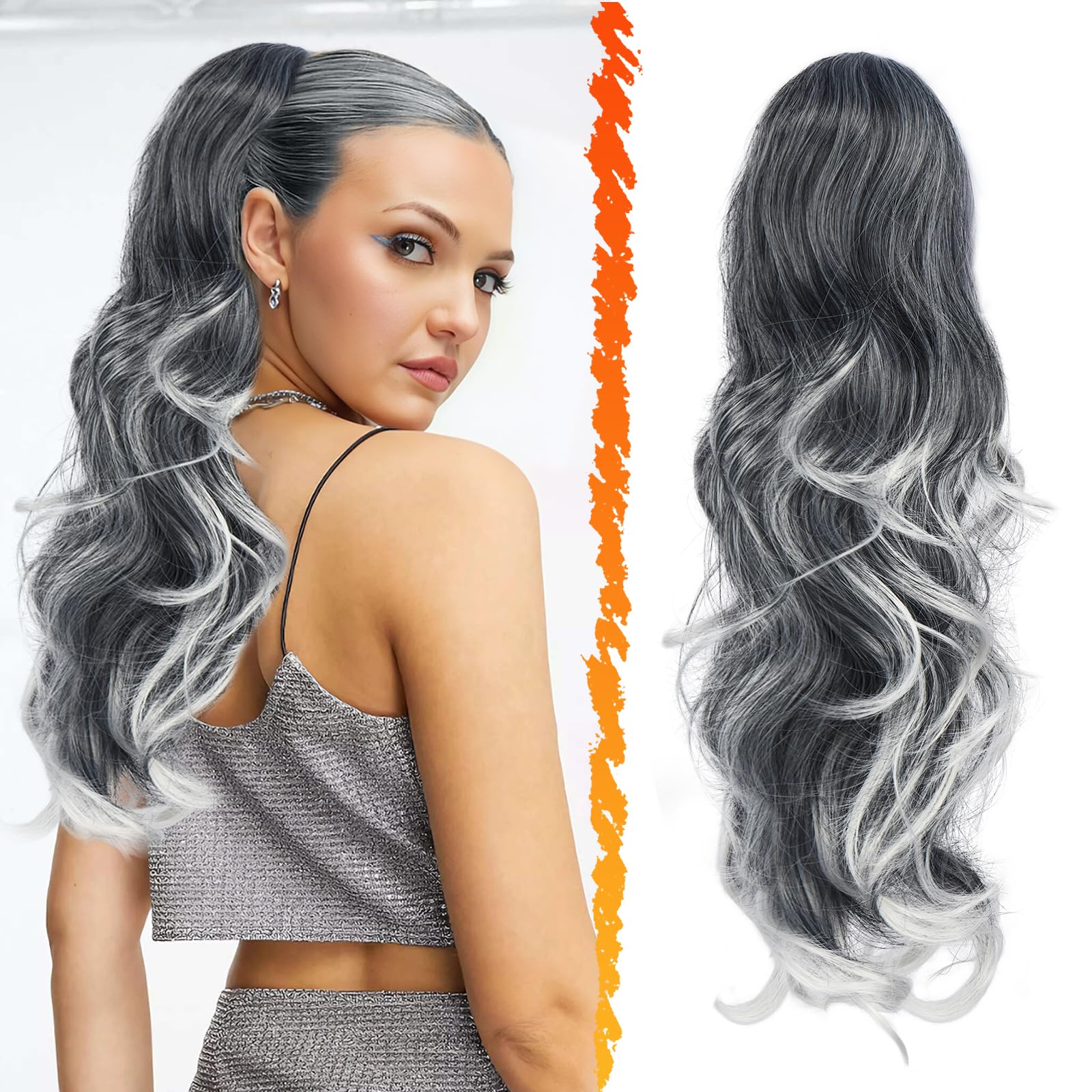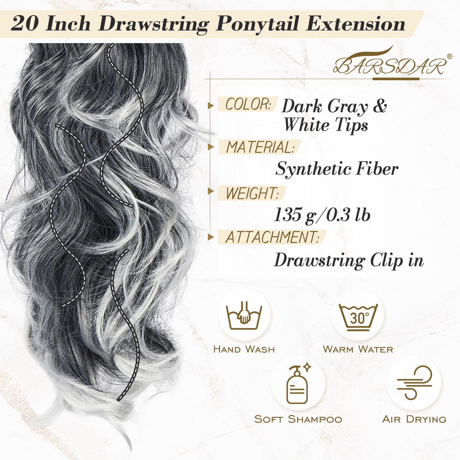 Extensii de par coada de cal, cu snur, 50 cm, ondulate si crete, gri cu varfuri albe