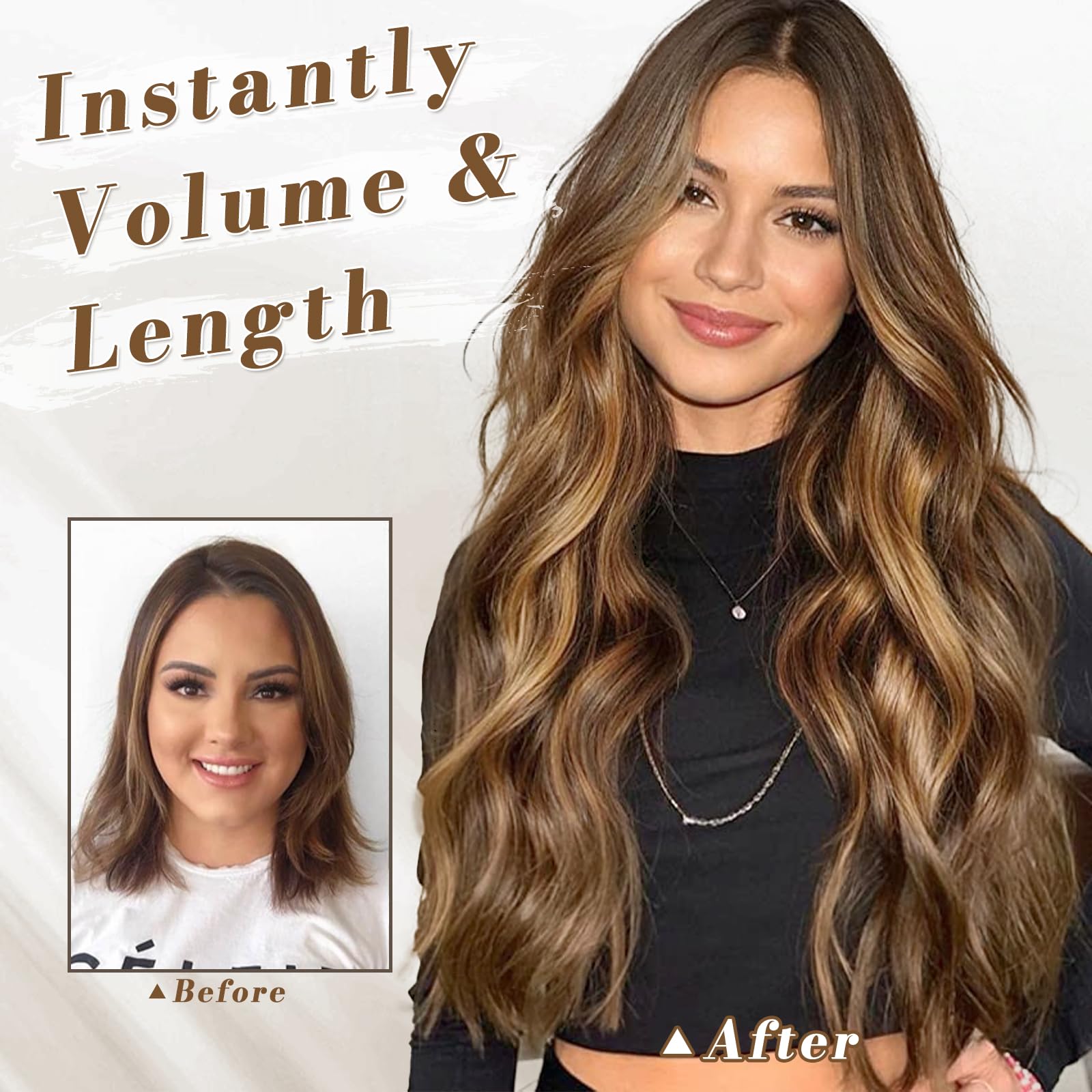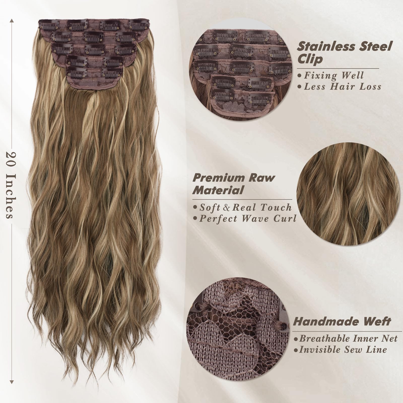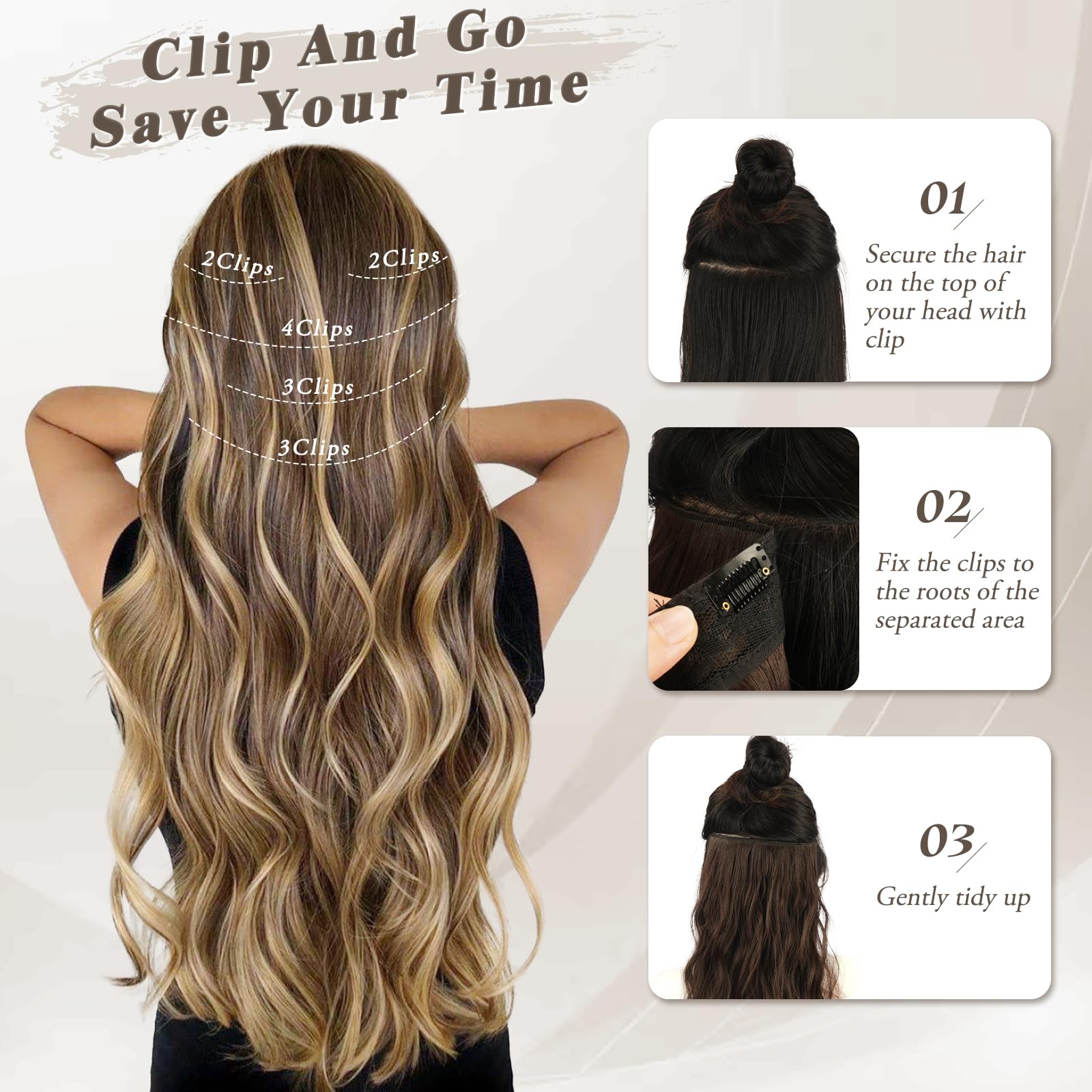 Extensii de par cu clips, 50 cm, sintetice, ondulate, Balayage, maro cenusiu si blond