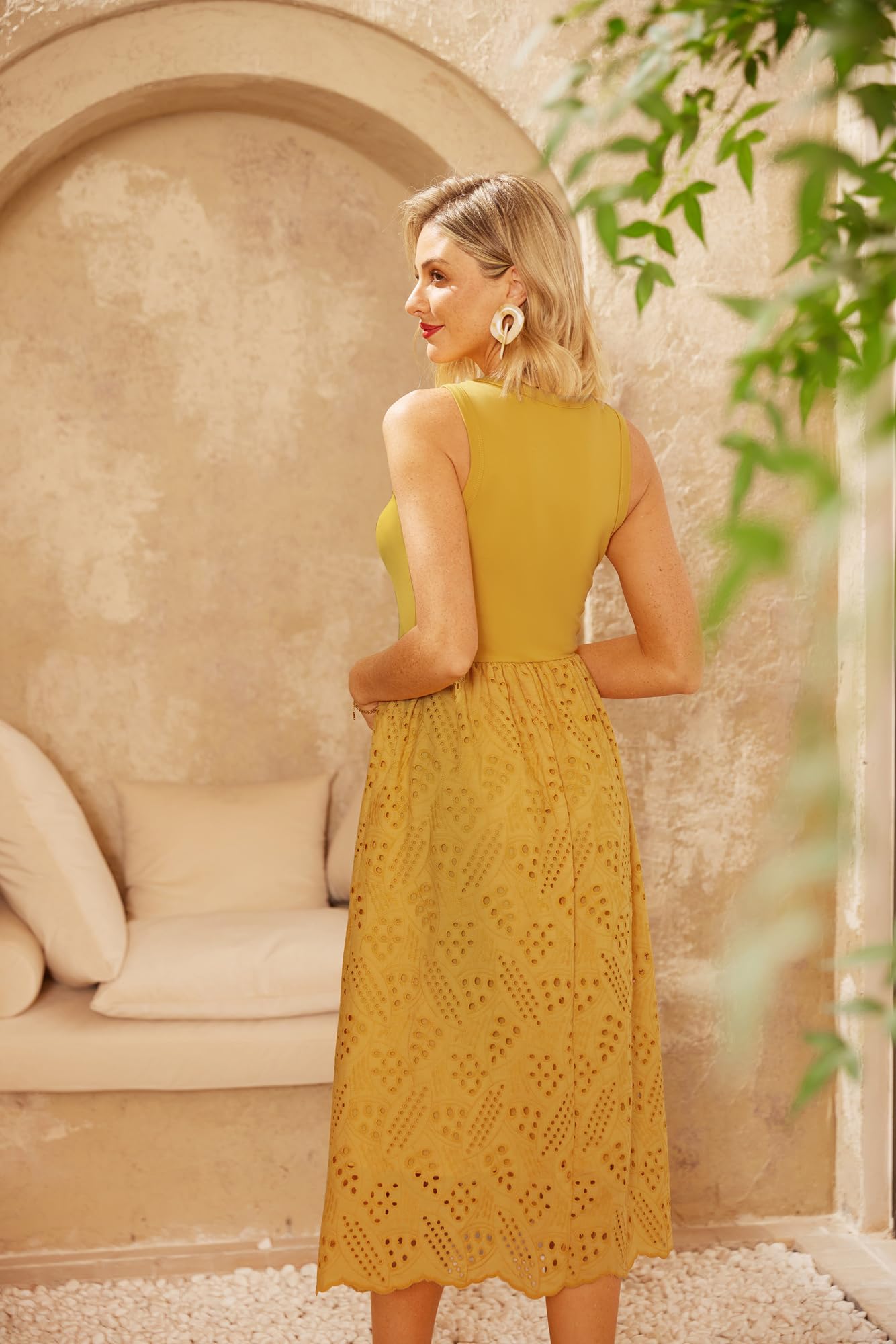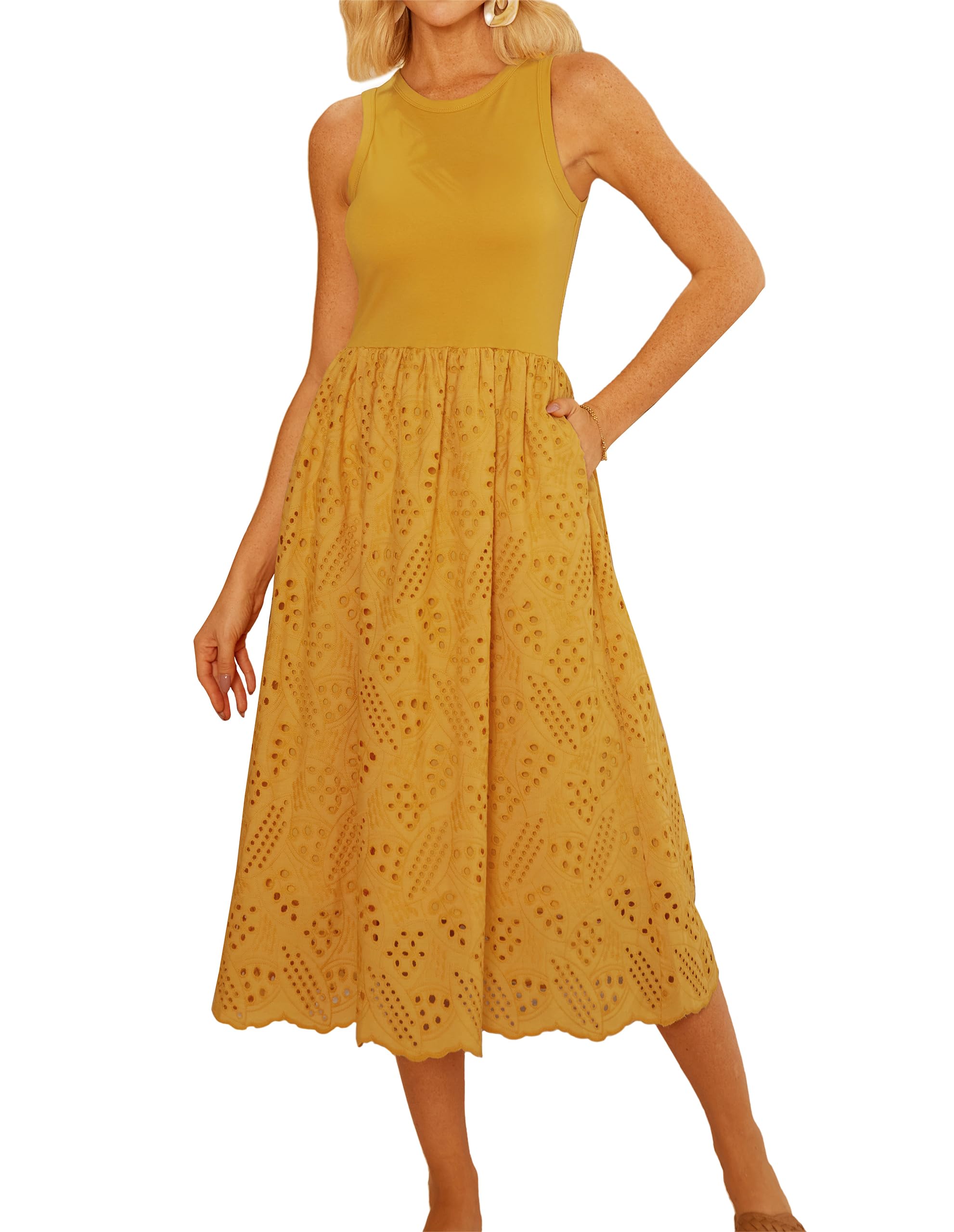 GRACE KARIN Rochie de vara, fara maneci, pentru femei, model A, midi, cu buzunare, broderie cu ochiuri, galbenă, XXL