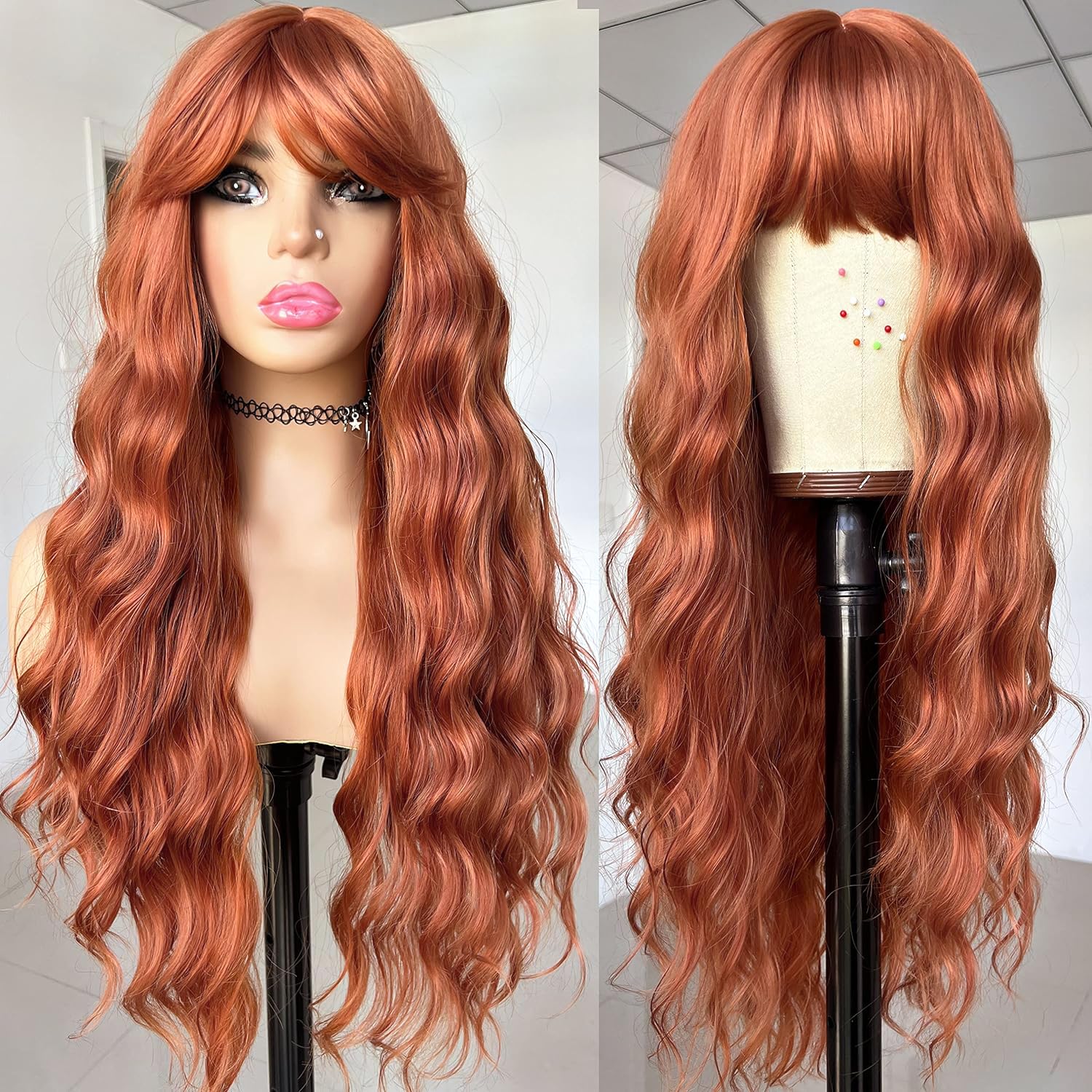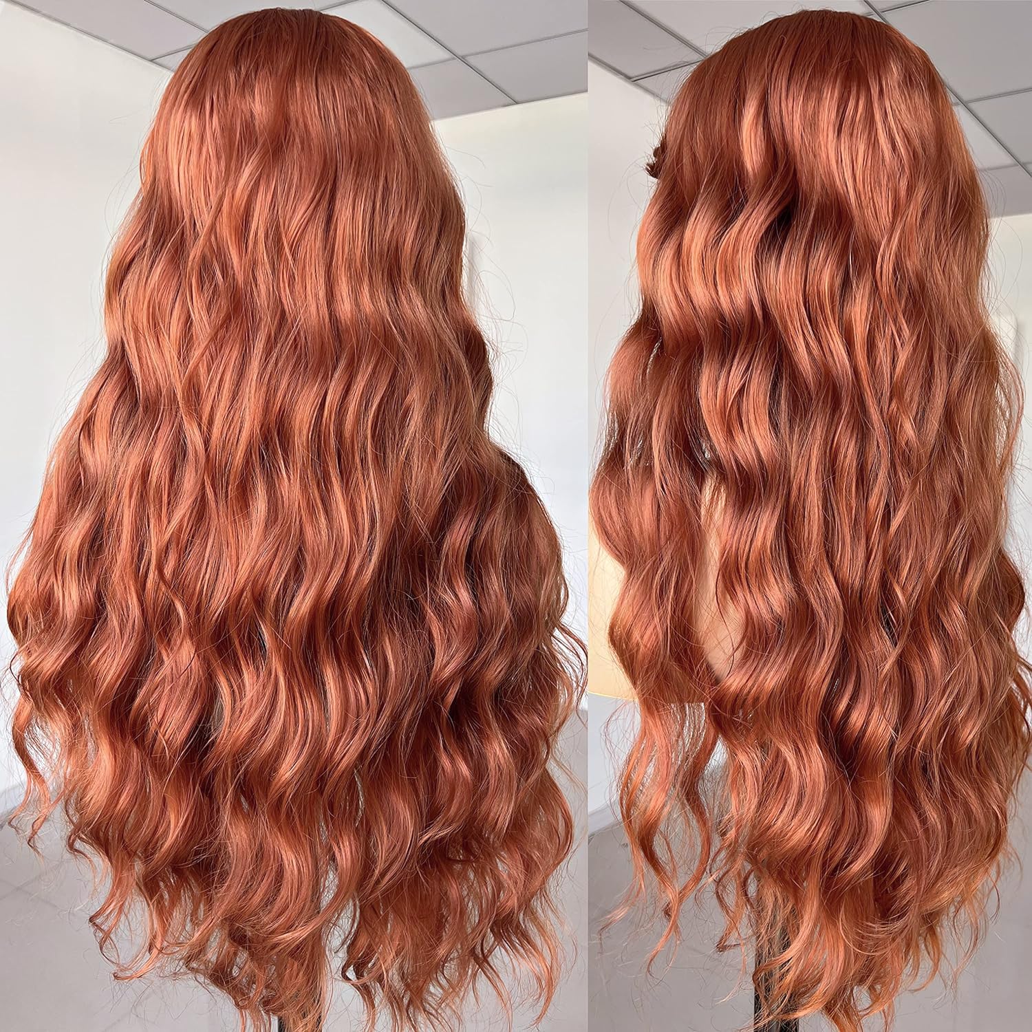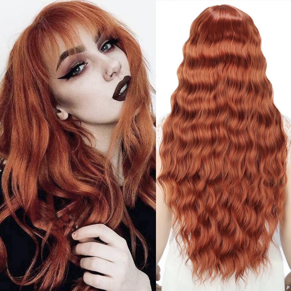Peruca lunga si creata, cu breton, par blond natural, rosu castaniu