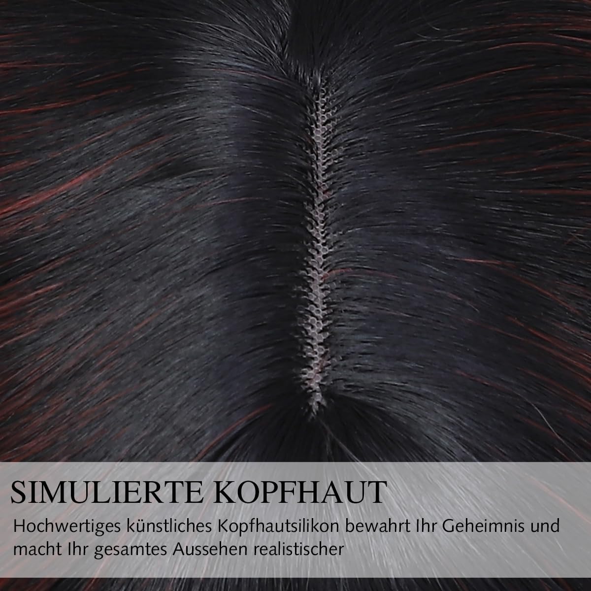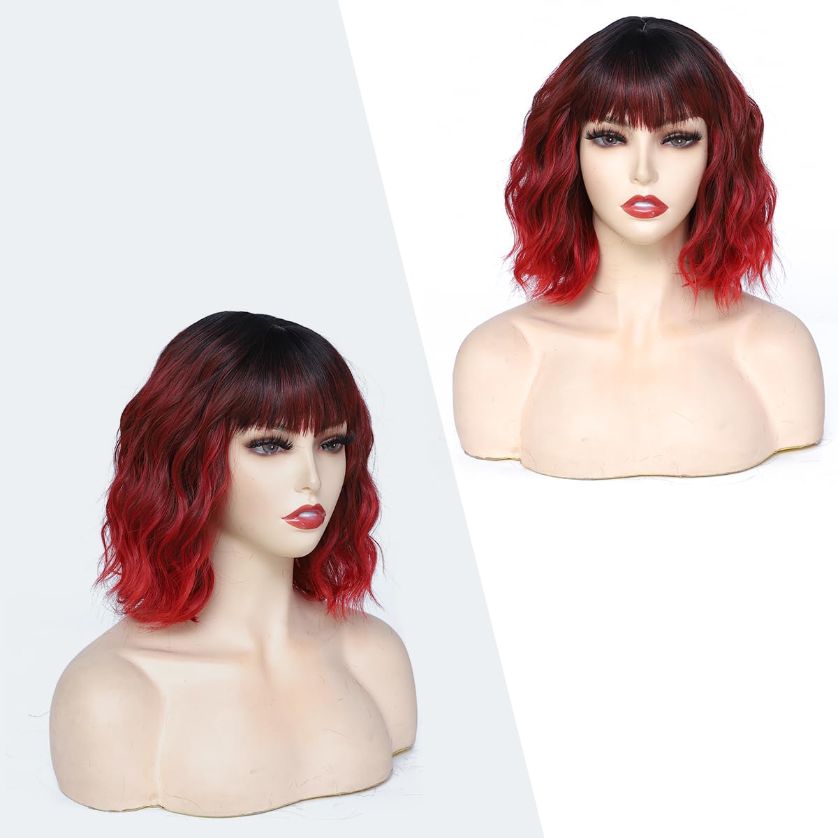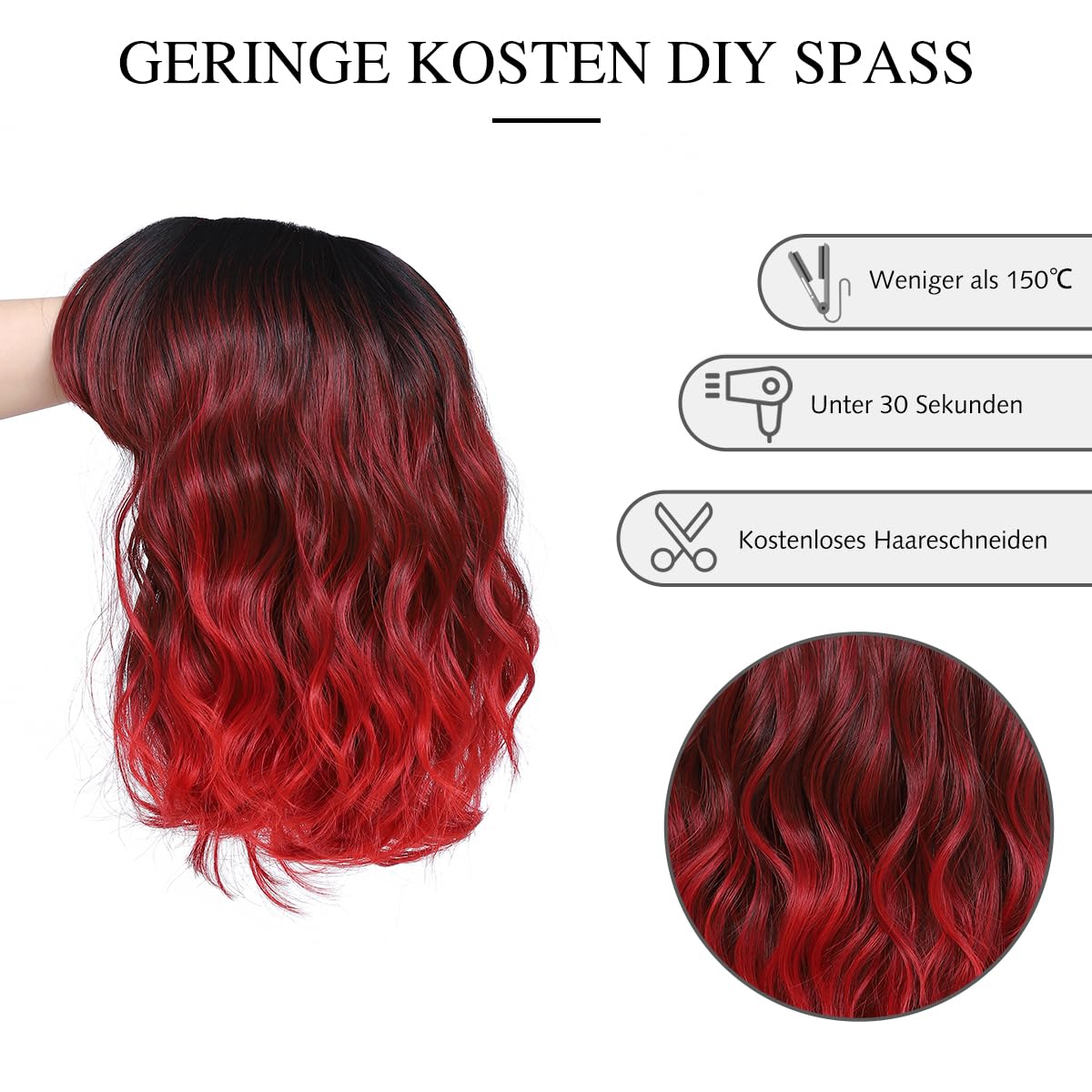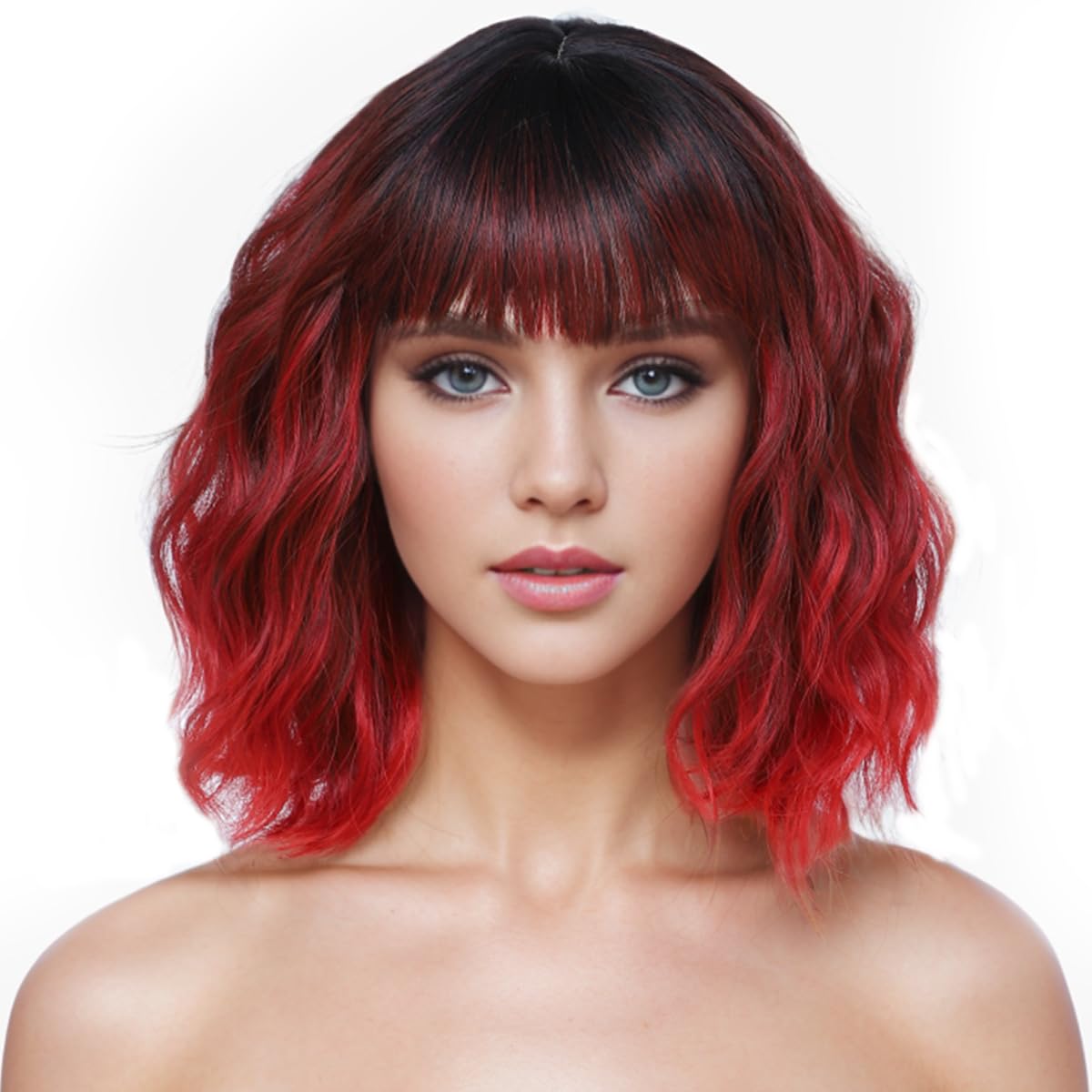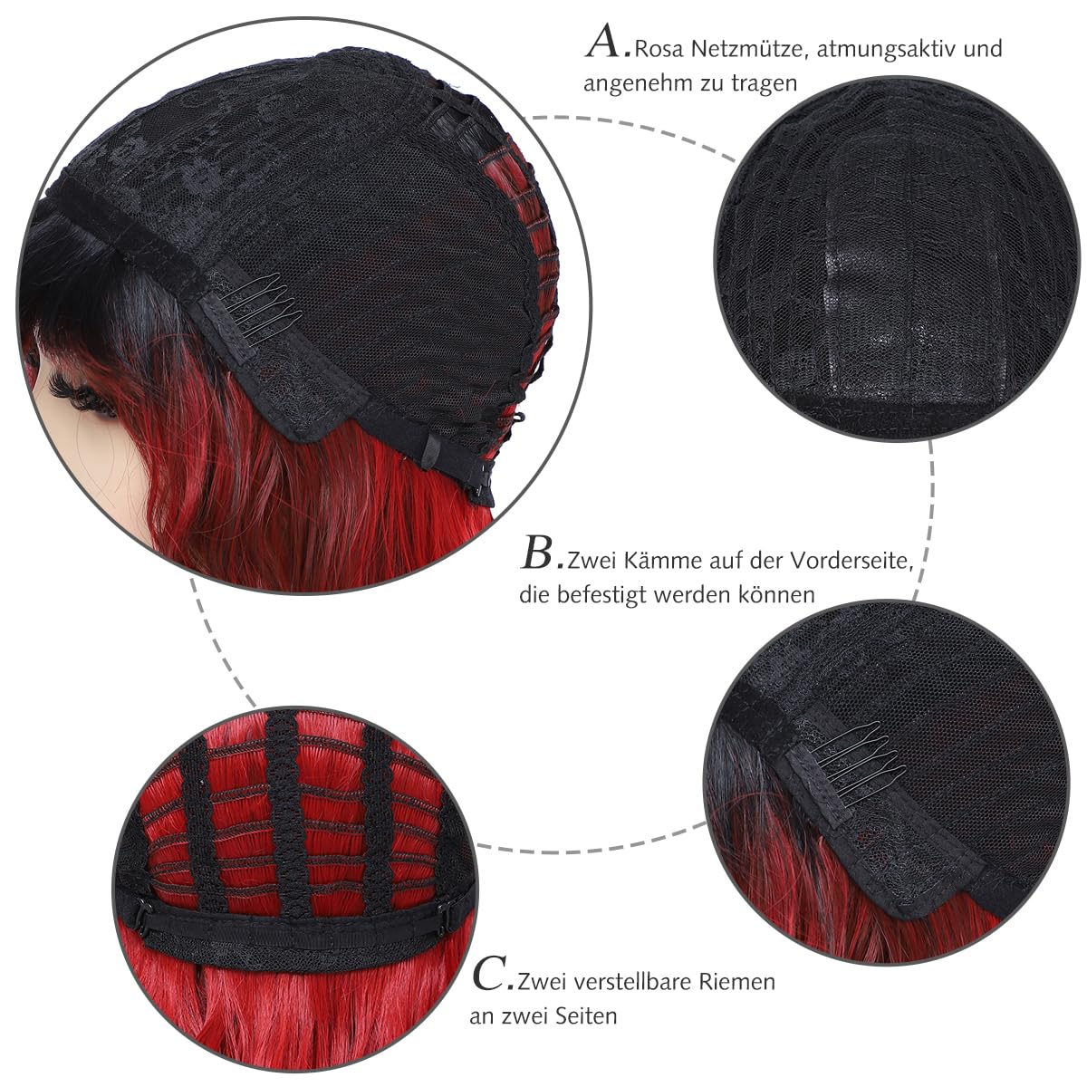 Peruca scurta, bob, cu breton, par sintetic, ondulata, pentru femei, negru si rosu, 30 cm