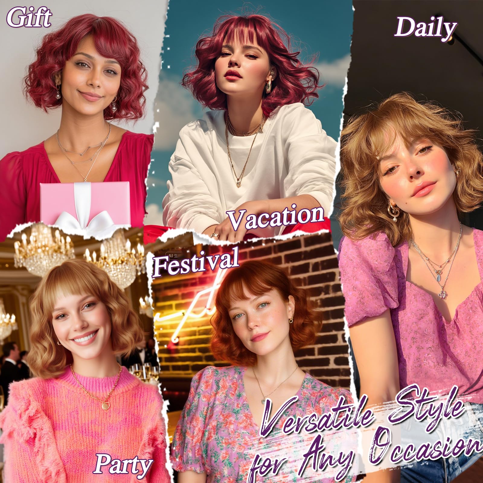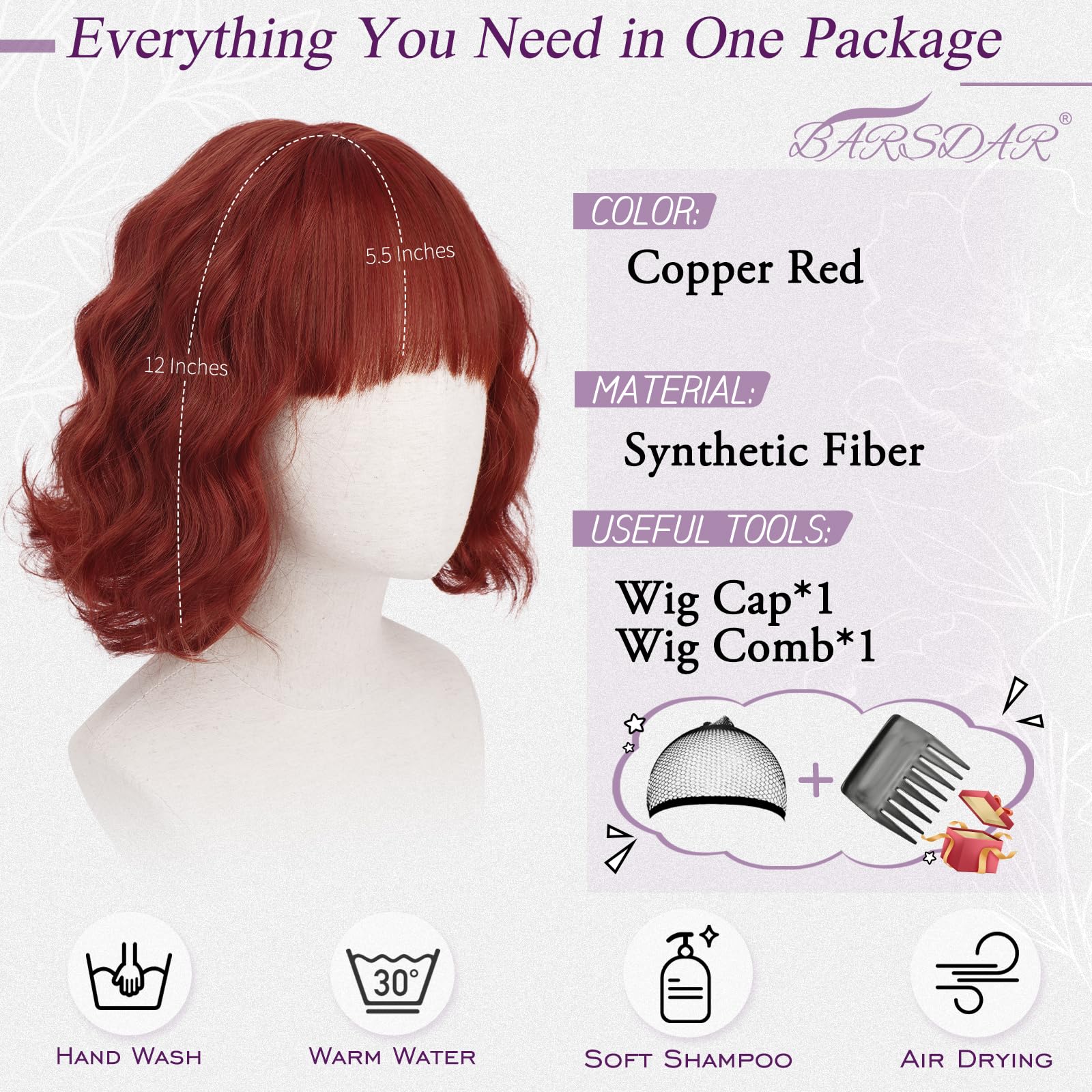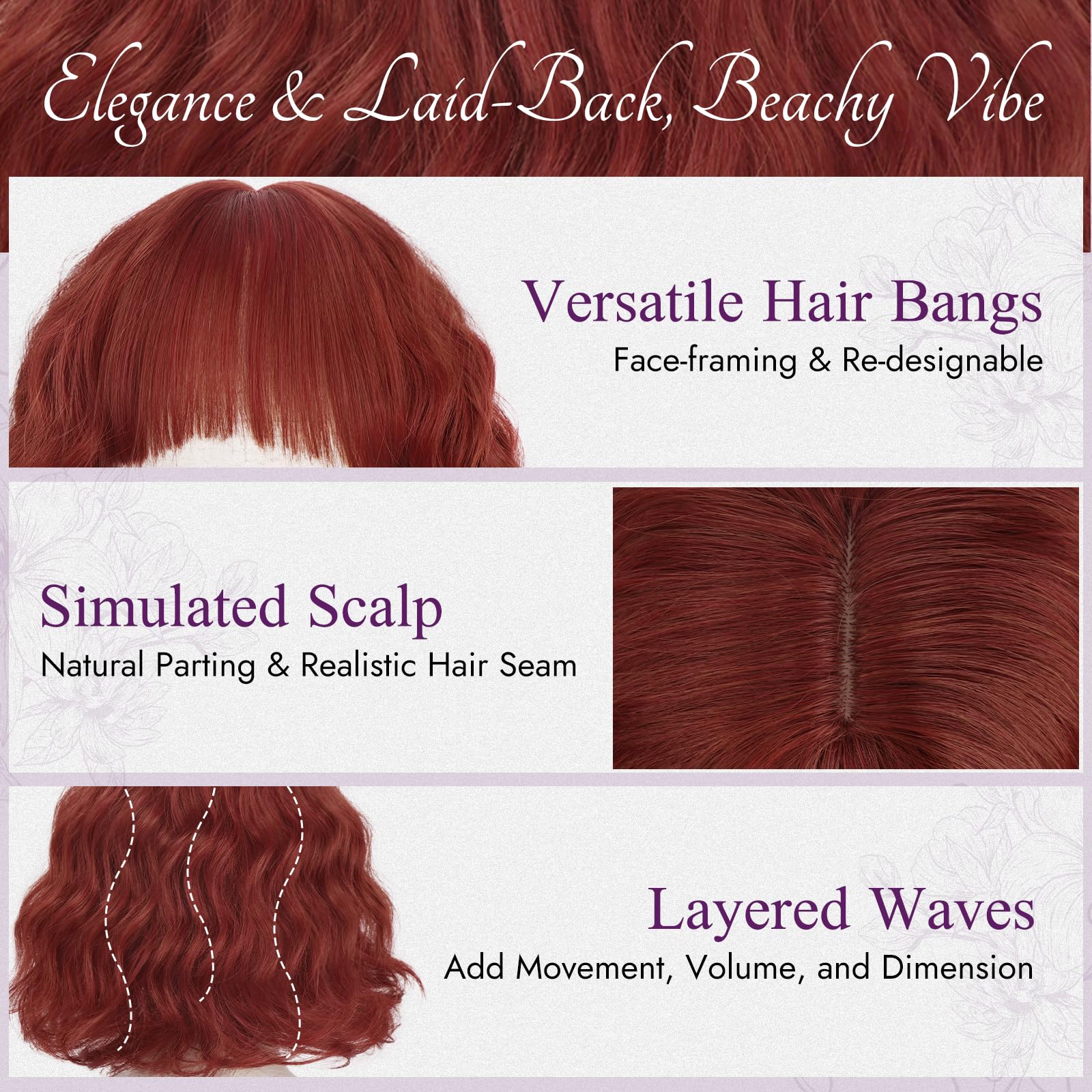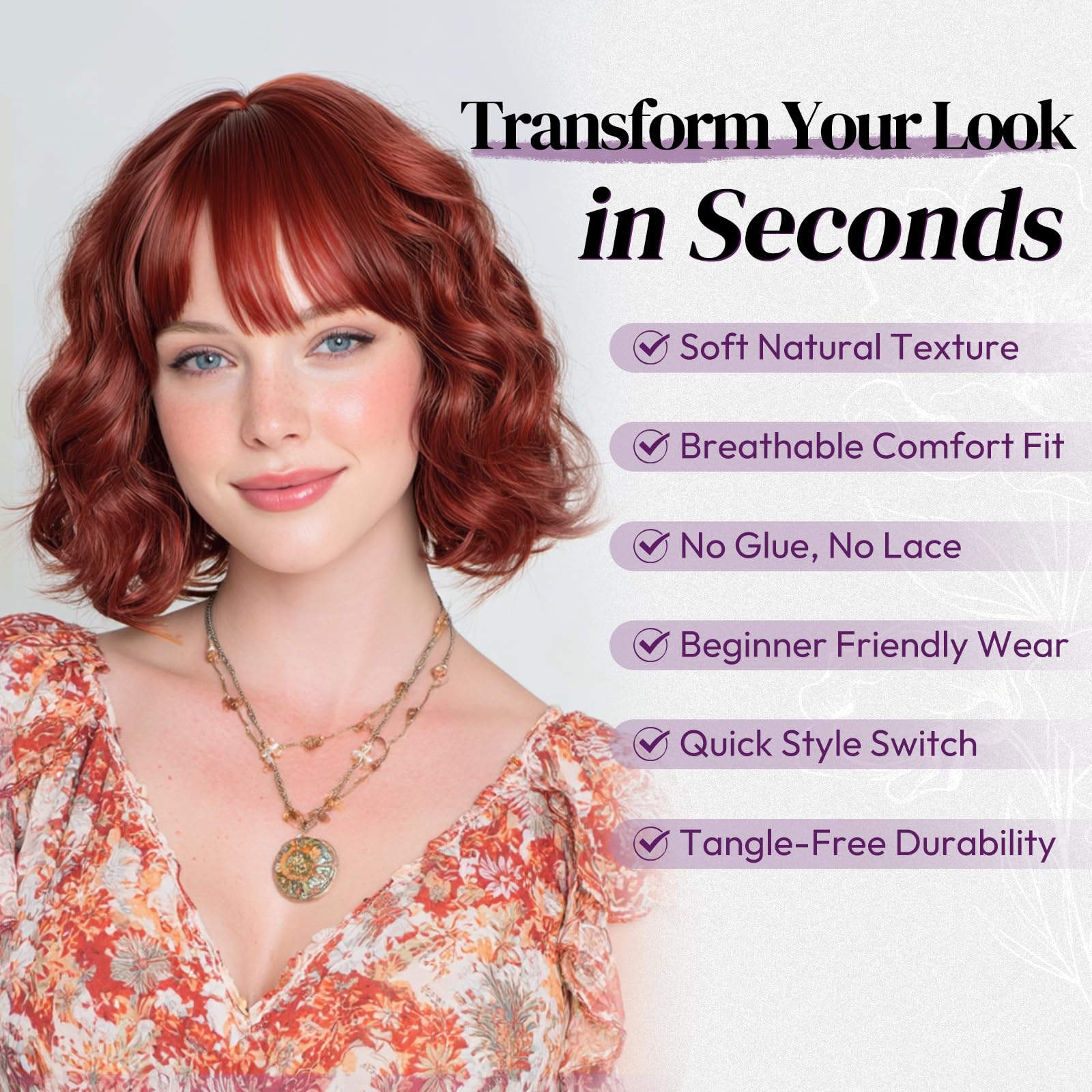 Peruca scurta, ondulata, rosu-cupru, cu breton, bob texturat si cret