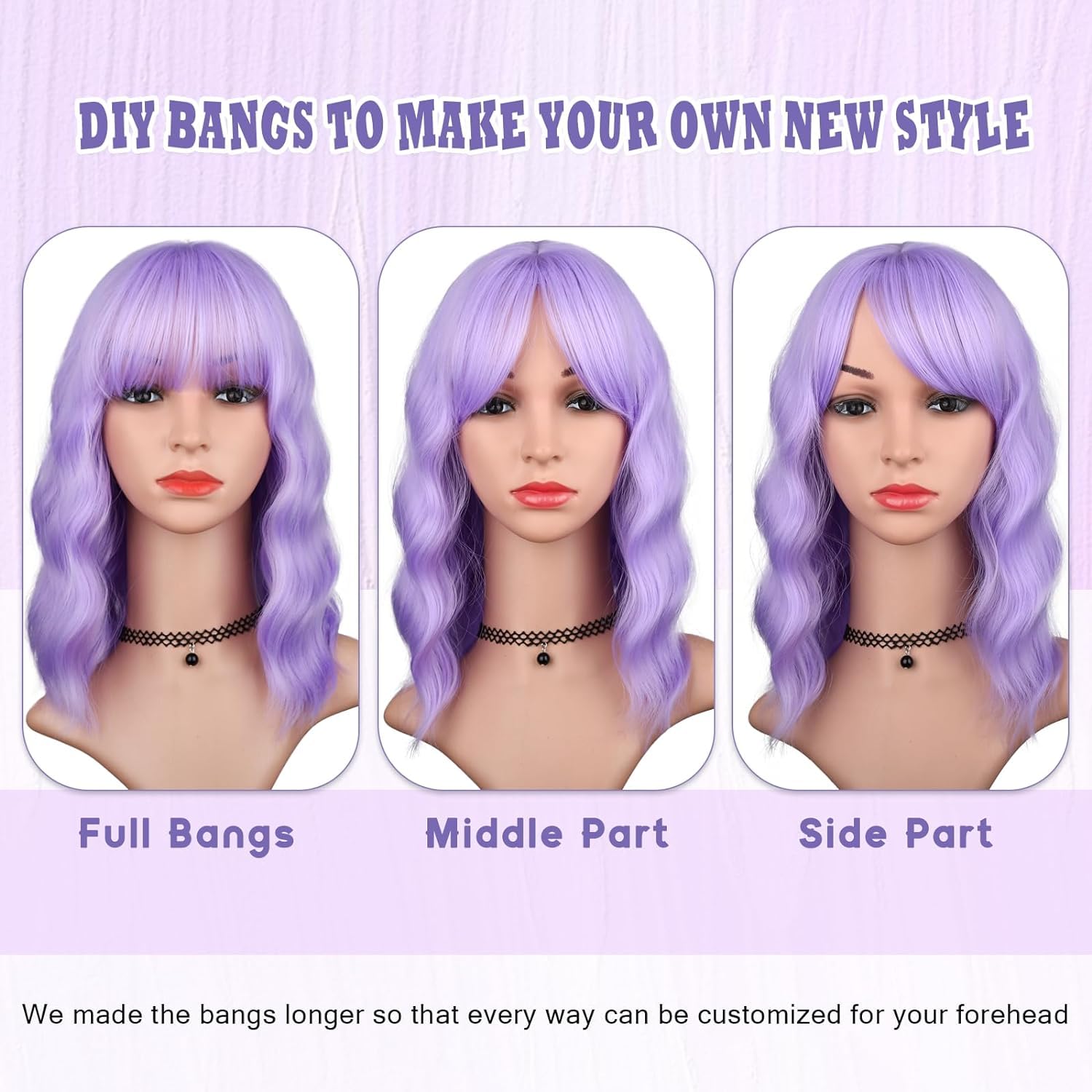 Peruca ondulata violet deschis cu breton ofera un look modern si atragator instant