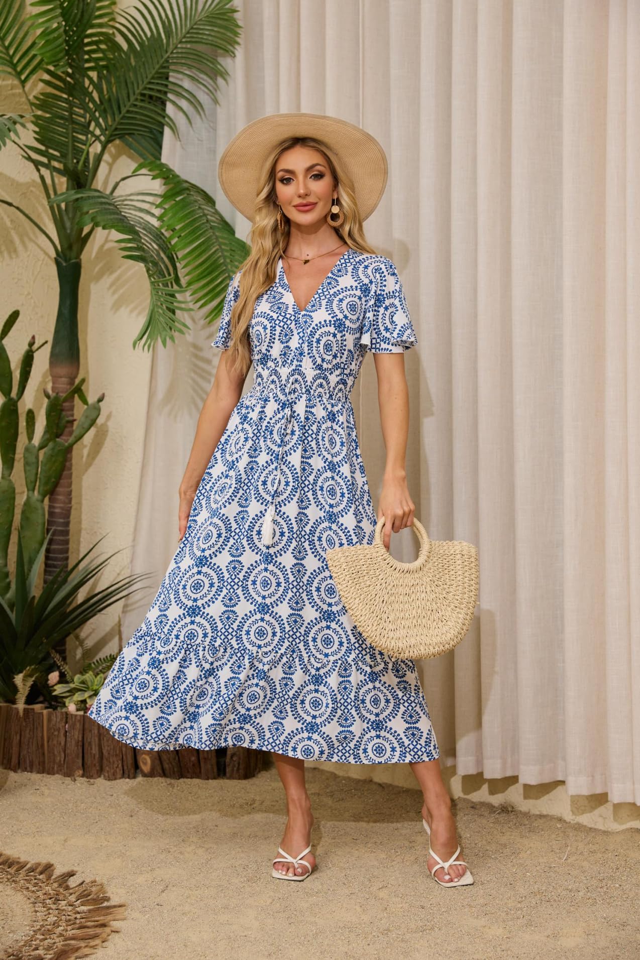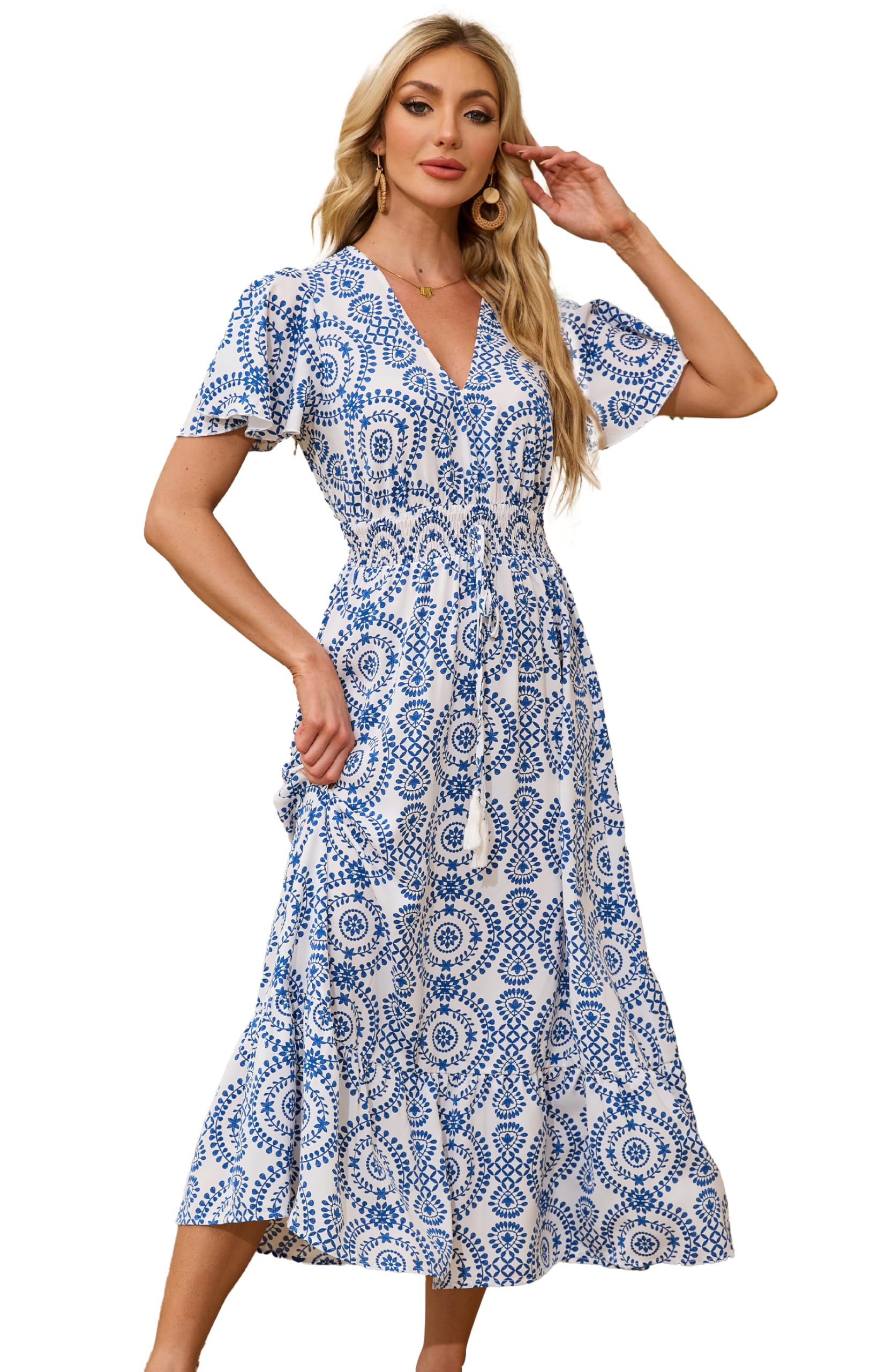 Rochie boho, de vara cu imprimeu floral si curea, decolteu in V, maxi, alb cu albastru, L