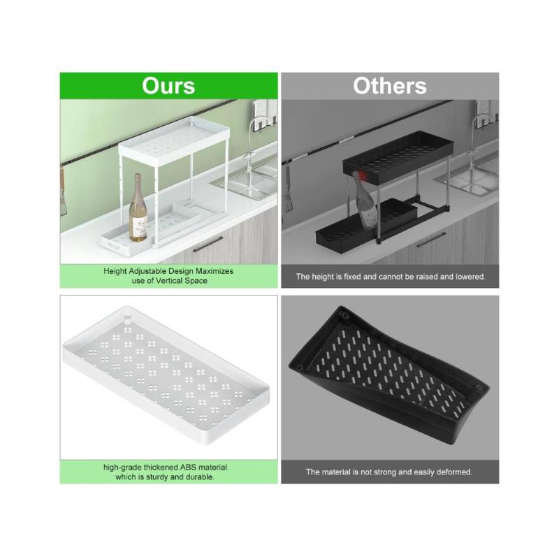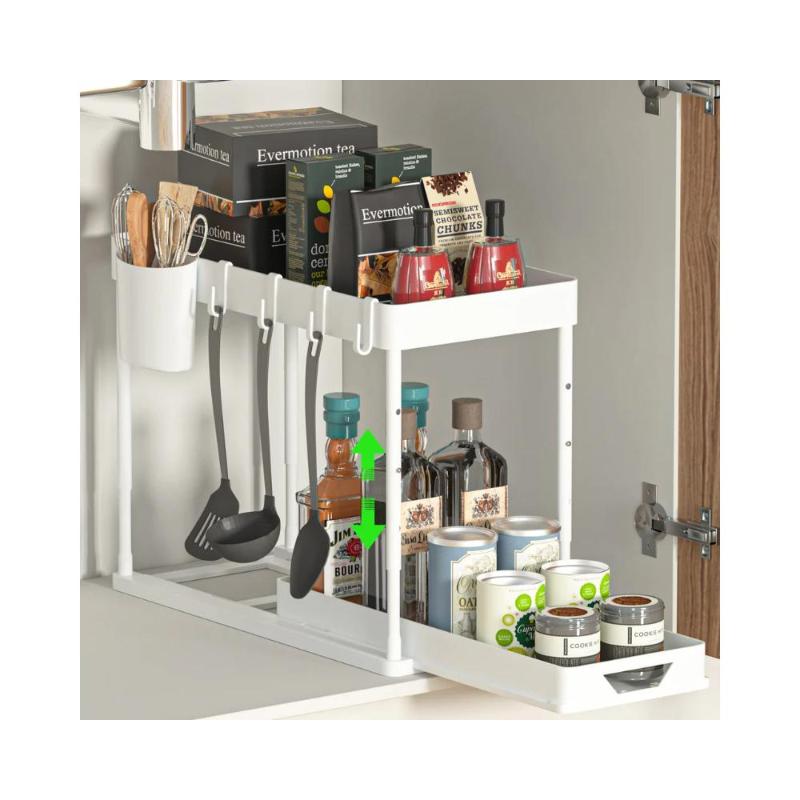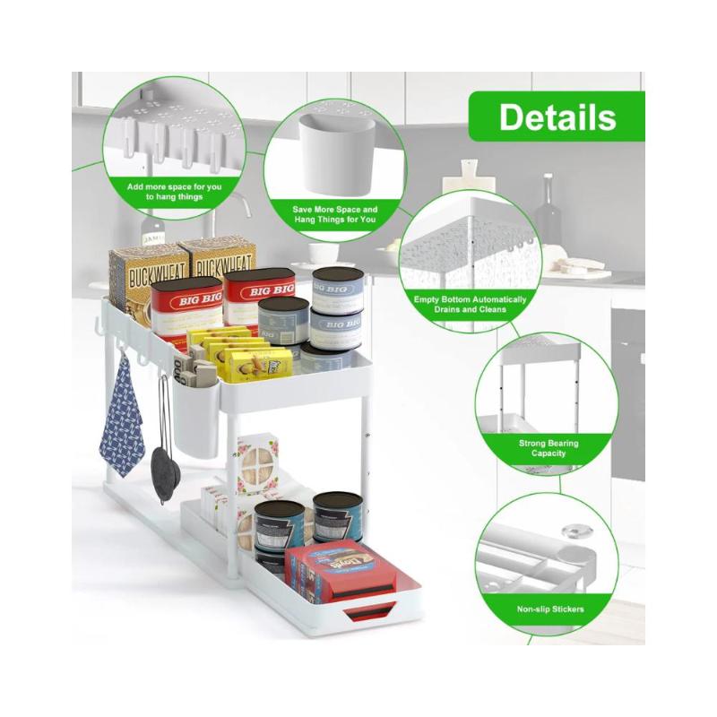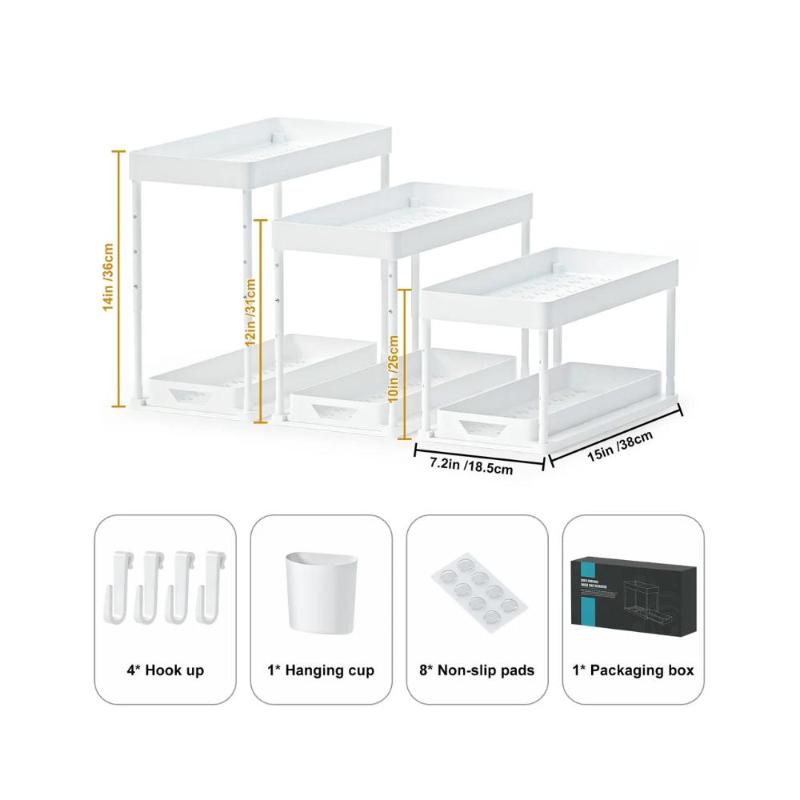 Set 2 x organizator sub chiuveta, din plastic, cu doua nivele, 4 carlige si un buzunar, inaltime reglabila 26/31/36cm, adancime 38cm, latime 18.5cm